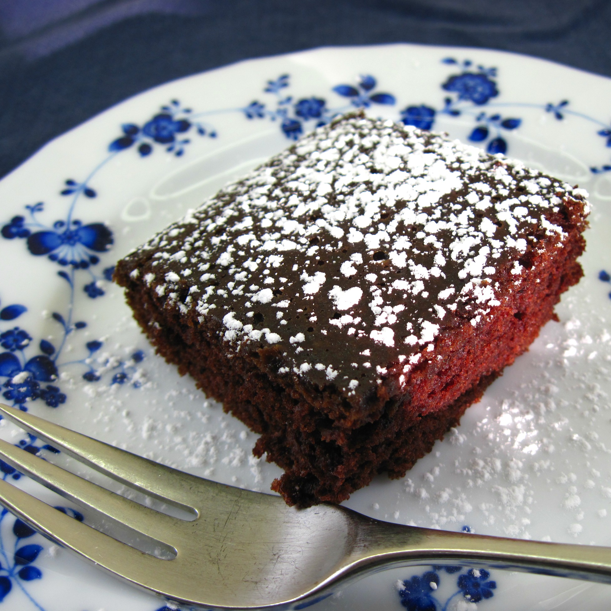 This recipe is from a 1986 cookbook called The New American Diet, by Sonja L Connor, M.S., R.D. and William E. Connor, M.D. It is lower in calories and fat than many cakes, but it “hits the spot” when you just want a bit of chocolate snacking cake.