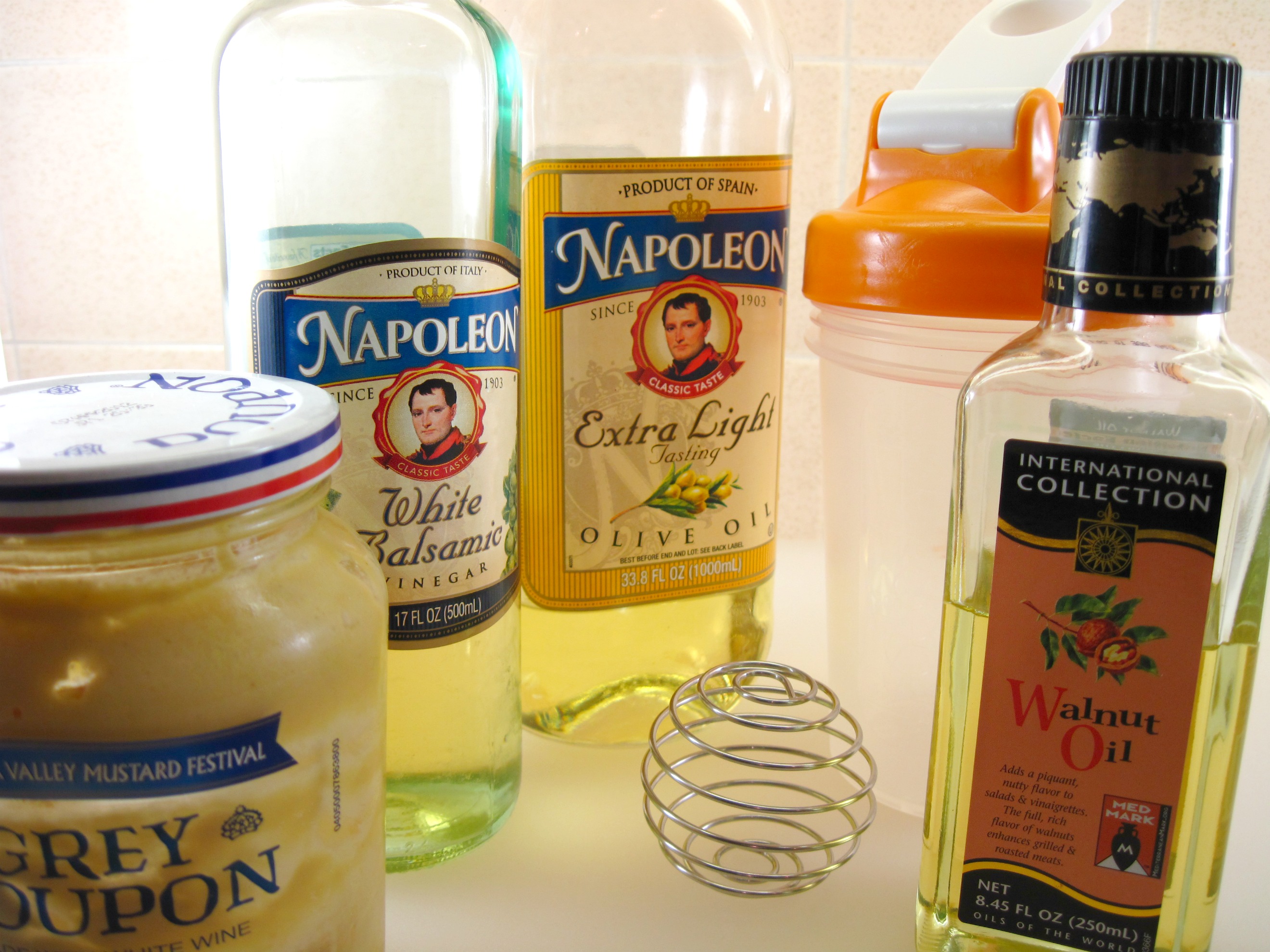 Jacques uses canola oil; I substituted light olive oil, which worked fine. You don’t want to use a flavorful olive oil here. He used white wine vinegar; I used white balsamic vinegar.