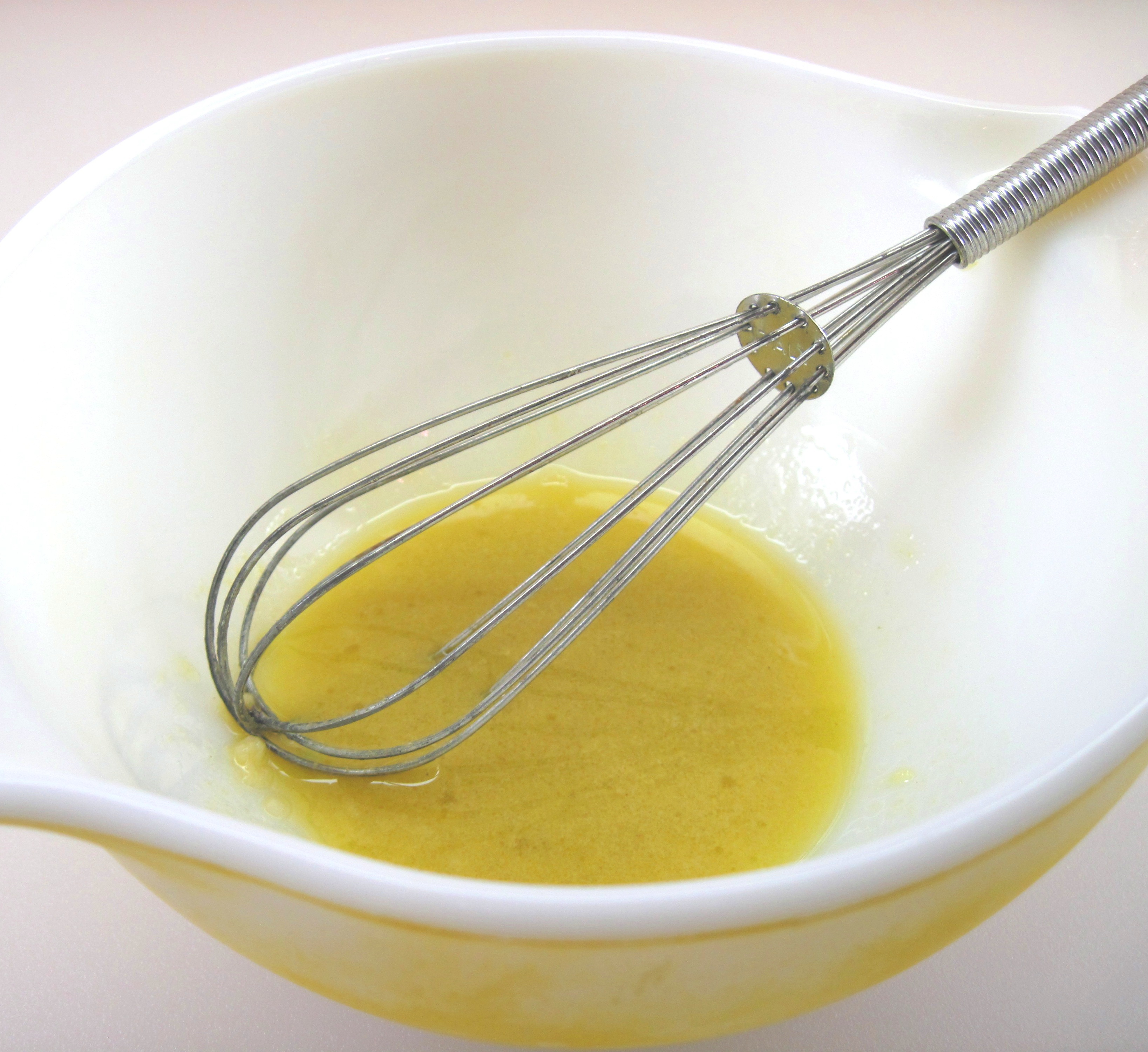 2. Whisk the olive oil, vinegar, and mustard together. Press the garlic clove into the dressing and whisk to blend.