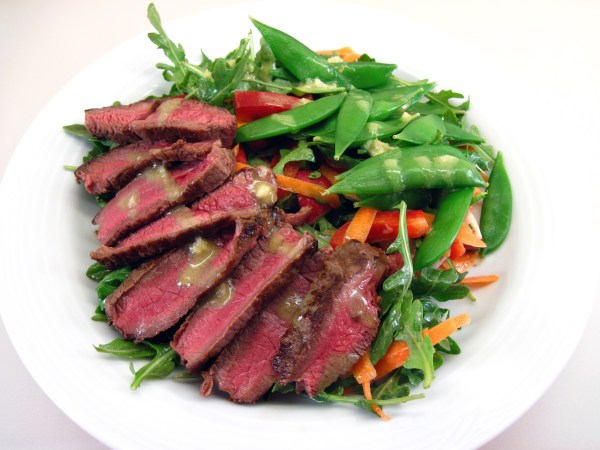 11. Slice the steak against the grain, and add it to the salad. Drizzle the salads with the remaining dressing and serve.
