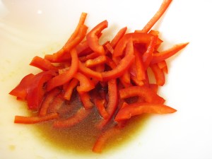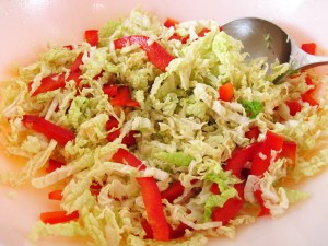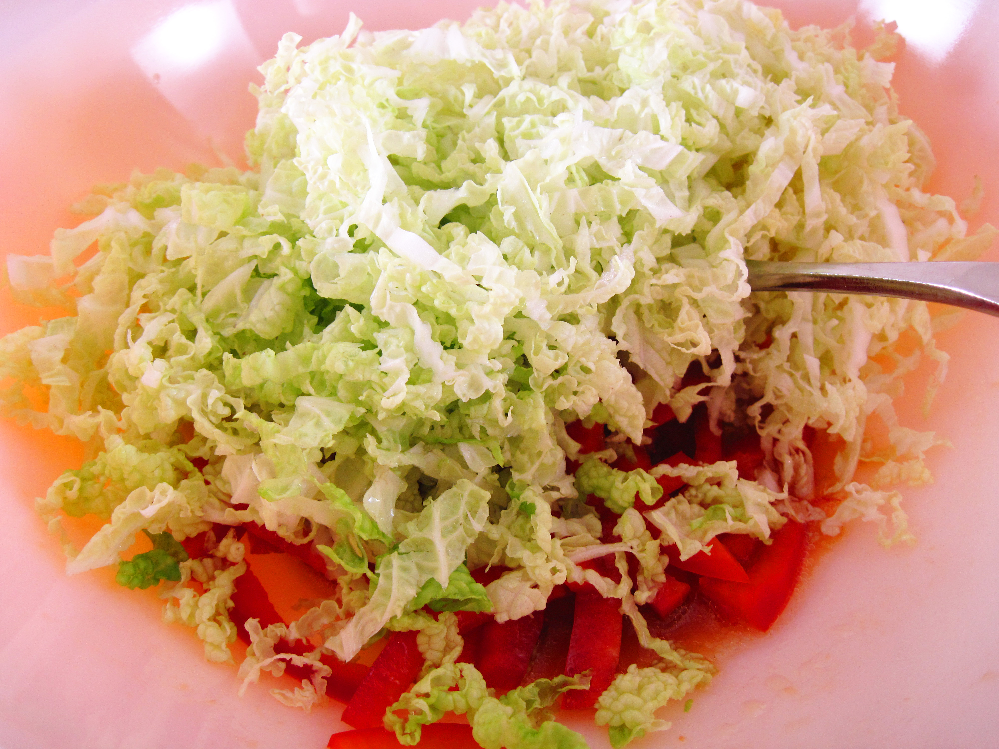 2. Add the red pepper and cabbage to the bowl. Stir, and set aside.