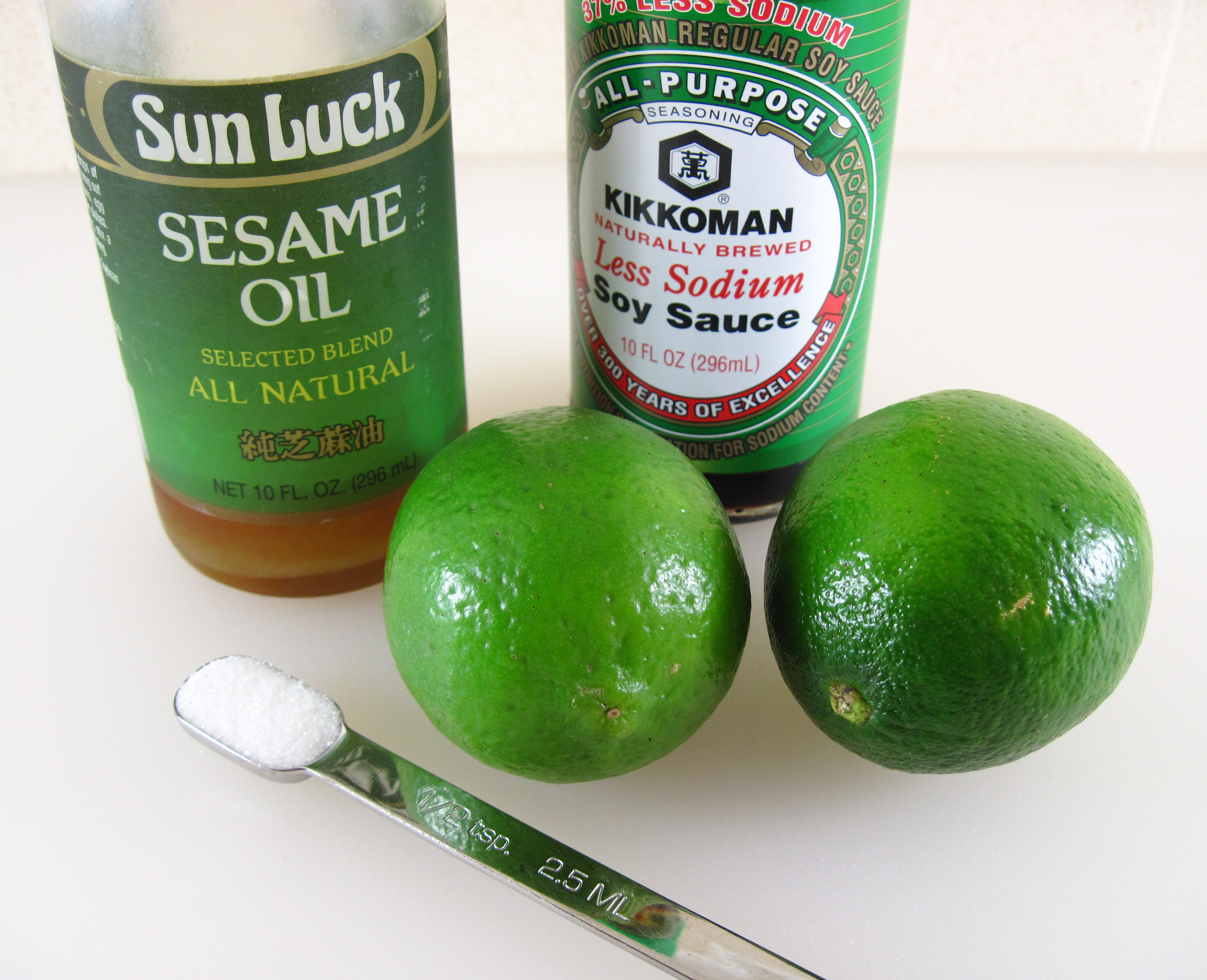 1. Stir the lime juice, soy sauce, sesame oil, and sugar together in a large bowl.