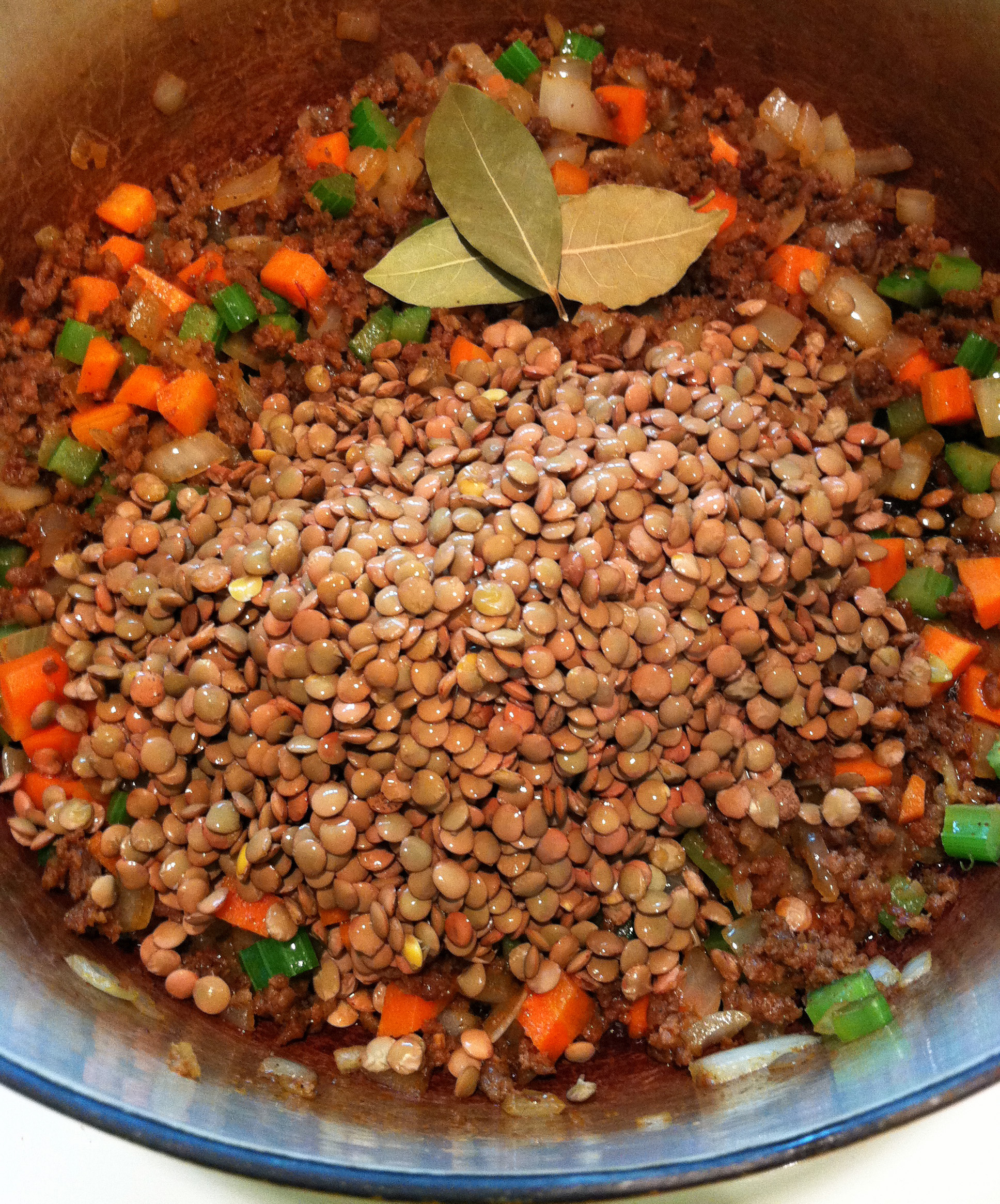 4. Add the lentils, bay leaves, and the 6 cups of water. Bring to a boil; cover and reduce heat so it is simmering. Cook for 25 – 35 minutes, until the lentils are cooked.