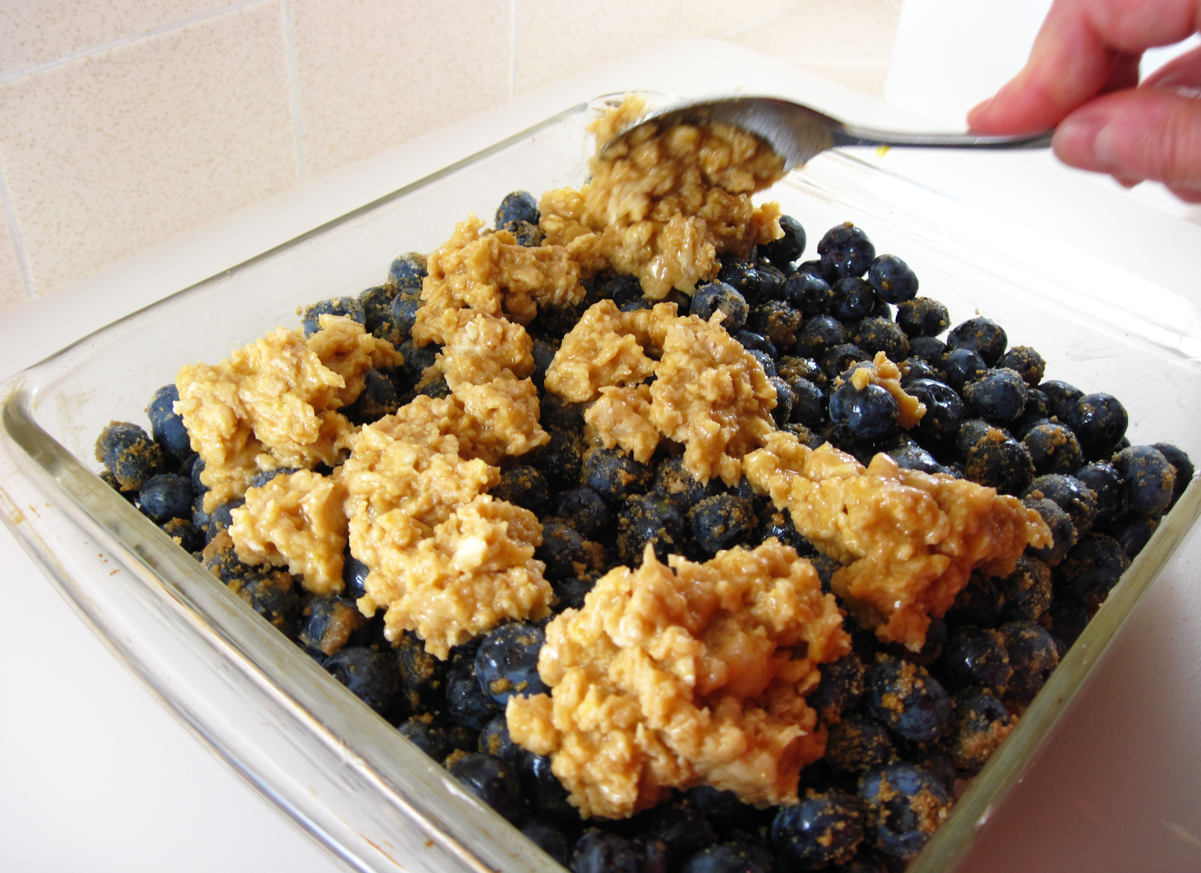 7. Drop spoonfuls of batter on the blueberries.