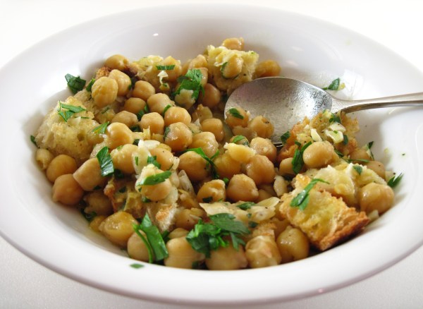 4. While the chickpeas are cooking, cut the bread into bite-sized pieces and spread them out on a baking sheet. Bake in a 400˚ oven for 5 or 6 minutes. Turn them over and continue to bake for another 5 or 6 minutes, until lightly toasted. Set the bread cubes aside; there’s no need to keep them warm.