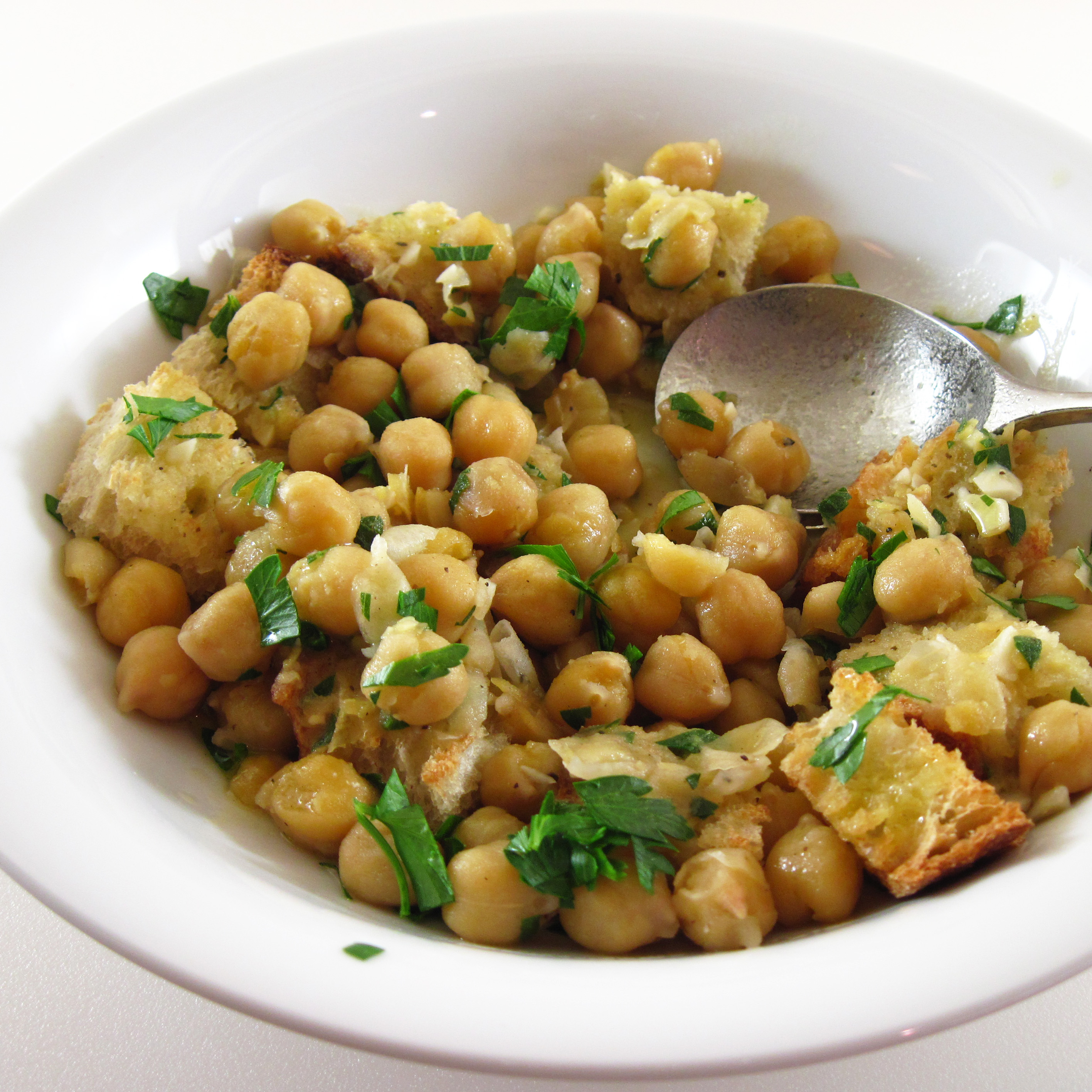 6. Put some bread cubes in each bowl. Top the bread with the chickpeas and some of the broth. Drizzle a bit of olive oil over all and garnish with the parsley.