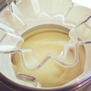 4. Take the freezer bowl out of the freezer; put it in the ice cream maker. Stir the cream mixture to make sure it is blended well and pour it into the ice cream maker bowl.