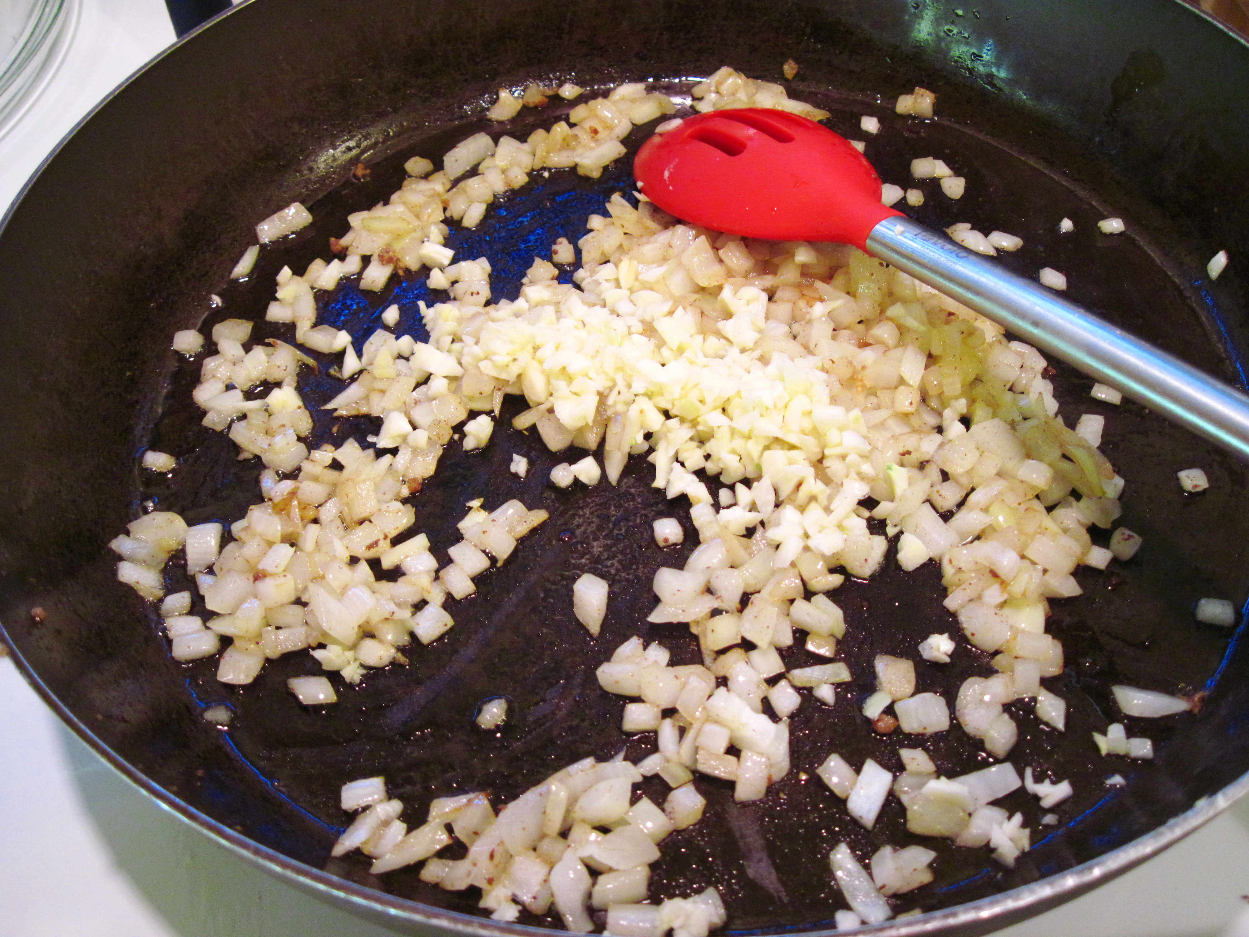 4. Add the onion to the pan, and cook until it is beginning to get tender, about 5 minutes. Add the garlic; cook, stirring, for about 30 seconds.