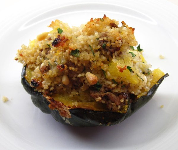 On their blog post Zach and Clay summed up Moroccan-Style Stuffed Acorn Squashes well: “Mmmmmmmmmm”. That was our reaction, too. The seasonings were perfect, and the sweet raisins and crunchy pine nuts added just enough contrast. I thought Martha’s idea to scoop the cooked squash out of the shells and stir it into the stuffing before baking was genius! It was so much better than just piling the stuffing into the cooked squash. Whether you use bulgur or rice, beef or lamb, I think you’ll enjoy this one!