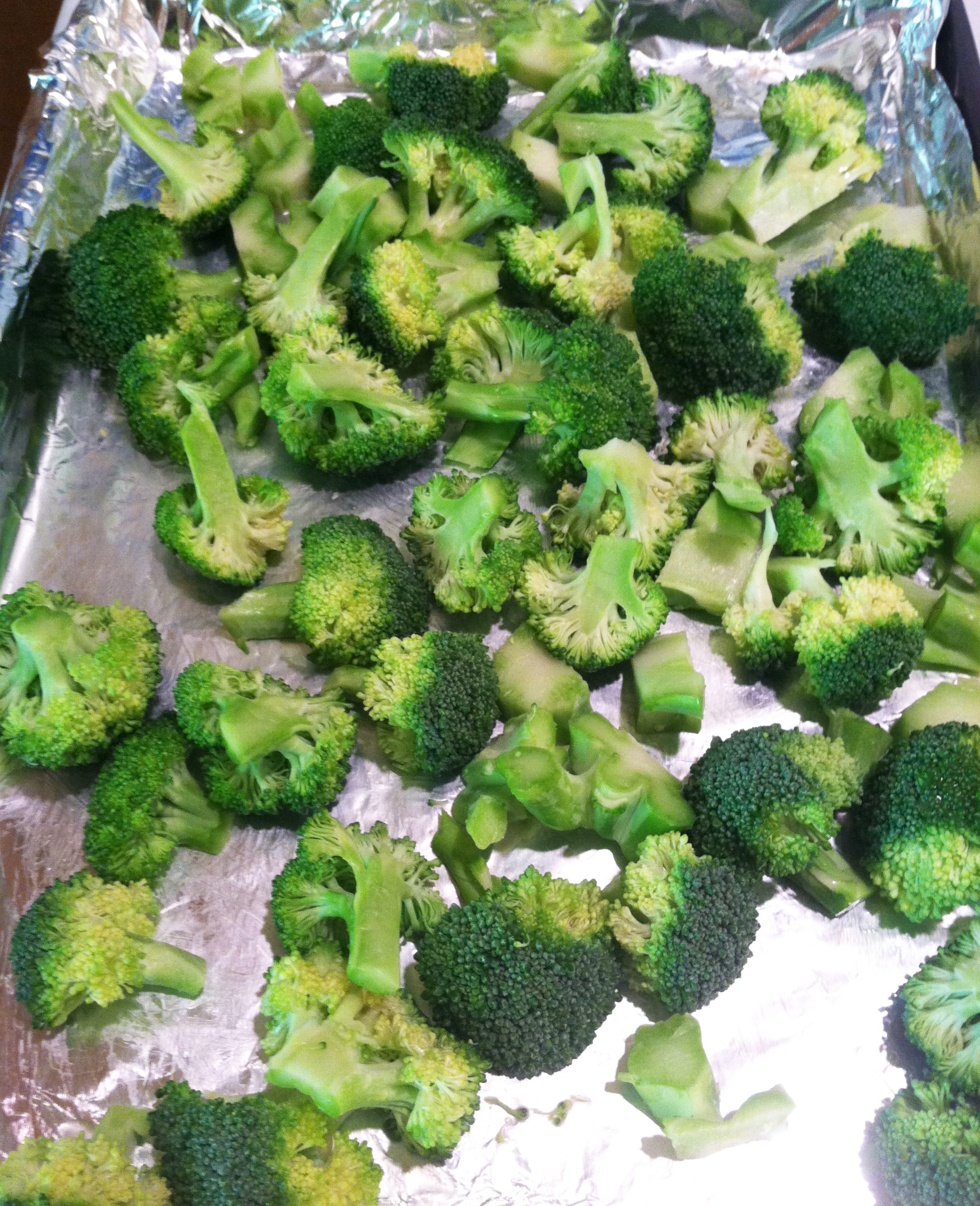 2. Peel the tough part of the broccoli stalk off and cut the stalk and florets into small pieces. Put the broccoli in a rimmed baking sheet, lined with foil if you wish.