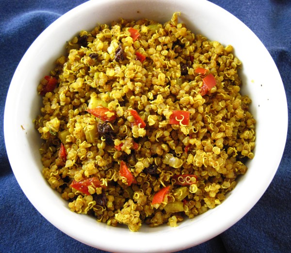 Indian Spiced Quinoa was inspired by a recipe I found on chow.com from Ann Gentry’s The Real Food Daily Cookbook: Really Fresh, Really Good, Really Vegetarian. I wanted to intensify the Indian flavor so I added curry powder and a bit of cayenne pepper.