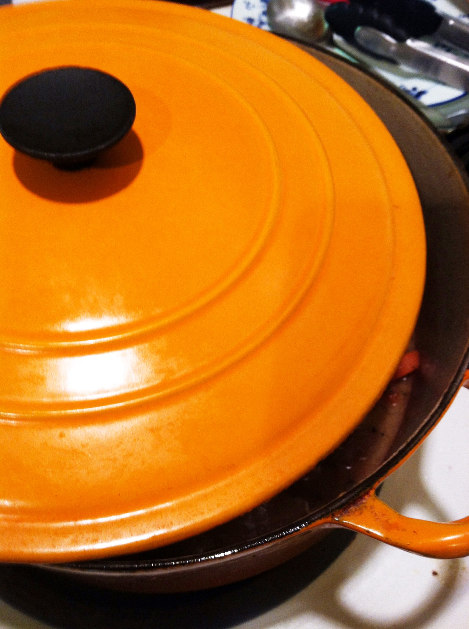 6. Put the lamb back into the pot, cover, and simmer over very low heat for about 2½ hours or until the meat is very tender. (I had to set my stove to the lowest heat possible to keep the stew at a simmer – with just a few gentle bubbles appearing at a slow rate.) I set the cover ajar for the last hour to help the stew thicken.