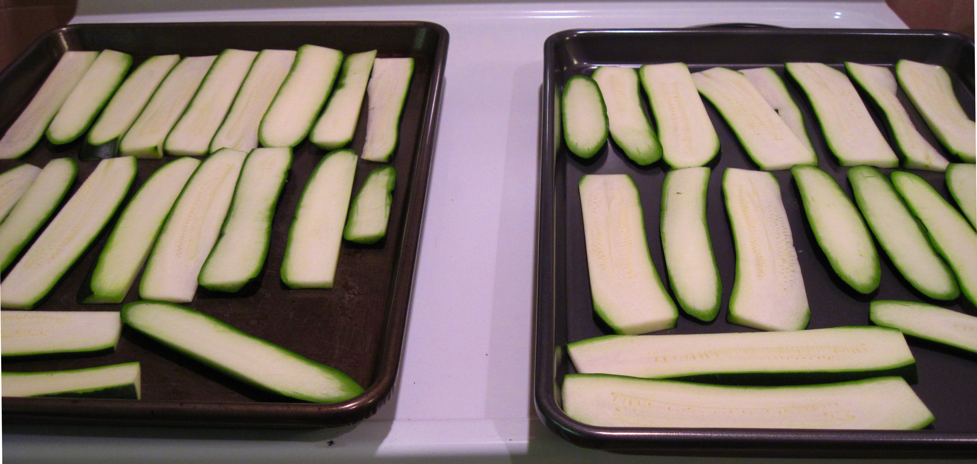 4. Roast the zucchini in the oven for about 15 minutes. You’ll probably need to use both oven racks. After 15 minutes, switch the baking sheets on the racks and roast for another 10 minutes, or until the zucchini is starting to brown. Remove from the oven.