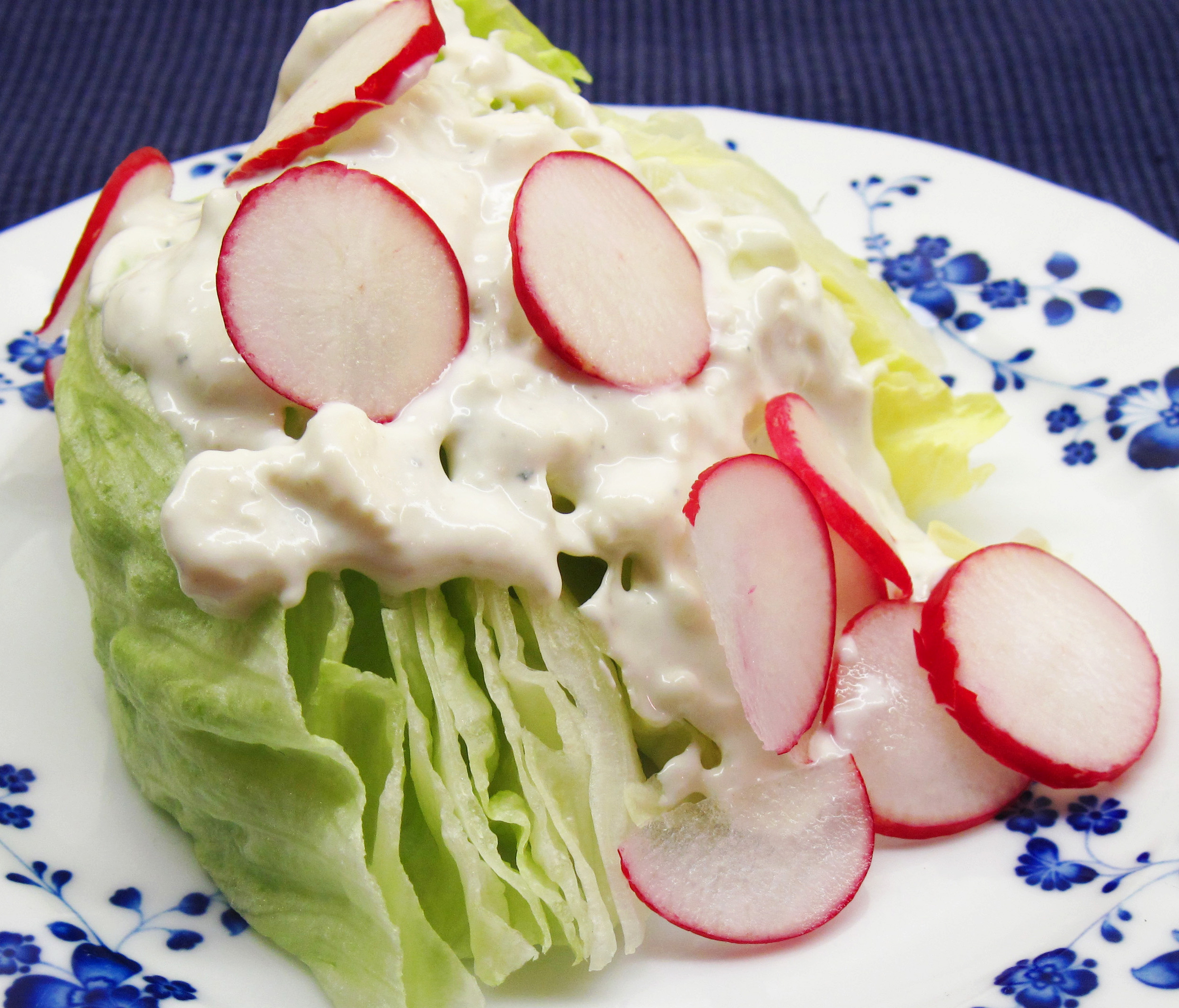 Homemade Blue Cheese Dressing served over a wedge of iceberg lettuce