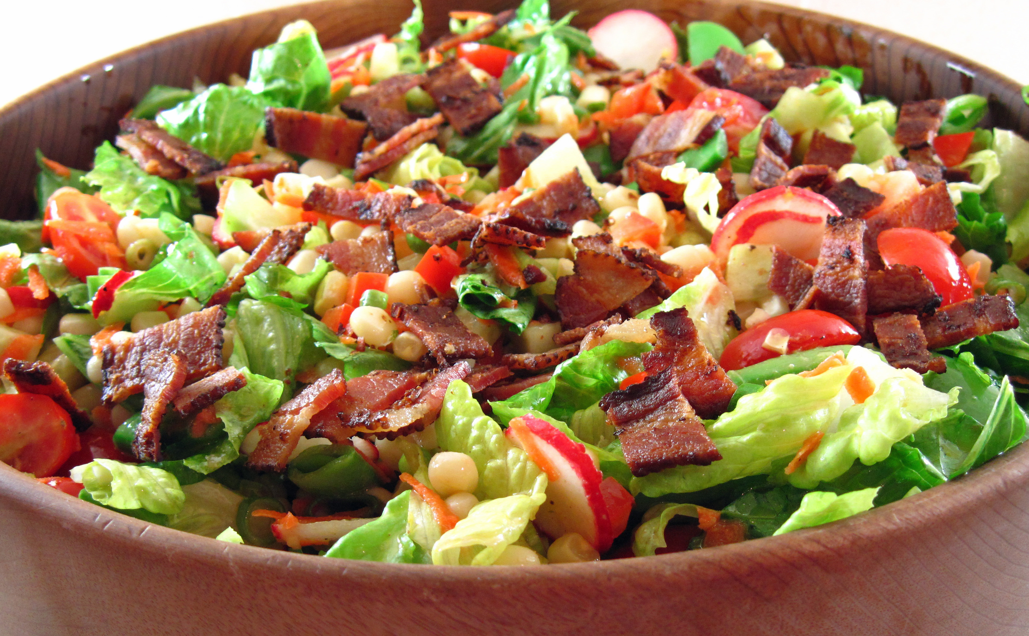 Tom suggests being creative with it. You could use diced salami instead of the bacon, or diced Gouda instead of the Parmesan. You could add diced celery or garbanzo beans. His only rule is that everything should be diced into small pieces and there should be more vegetables than lettuce.