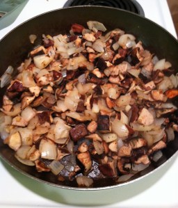 2. Gently clean the mushrooms with a damp paper towel. For portabella mushrooms, remove the stem and scrape the gills out with a spoon. For shiitake, cut the end of the stems off. Chop all of the mushrooms into chunks.