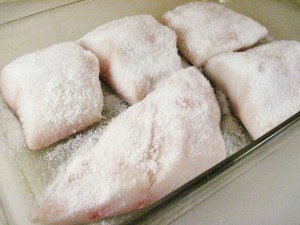 Mr. Bittman says you can use any thick fish fillets or steaks. I have made it with “true cod” (a Pacific cod from Alaska) which I really liked. I have also made it with black cod, aka sablefish, which was wonderful. (“Black cod” is actually not a cod; perhaps that is why the fish markets label cod as “true cod”.) The dish was equally delicious with both types of fish. Halibut or salmon would also be good.