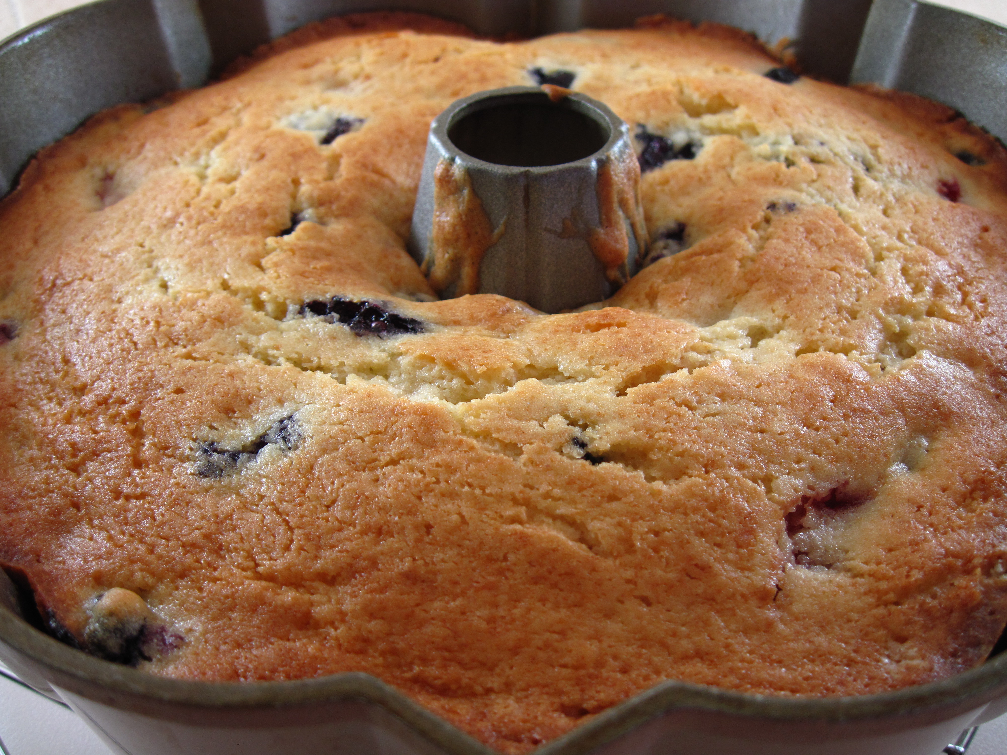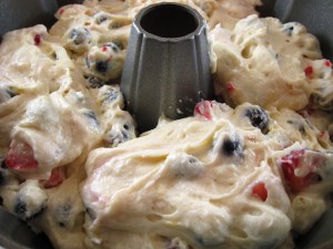 I first saw the recipe for Triple Berry Summer Buttermilk Bundt on Smitten Kitchen, where Deb Perelman said she had adapted it from a recipe in Rustic Fruit Desserts, by Cory Schreiber and Julie Richardson. Schreiber and Richardson use 3 cups of sliced rhubarb in their recipe. Deb substituted blackberries, raspberries, and blueberries for the rhubarb (1 cup of each), but she suggested that 4 cups of fruit would be even better.