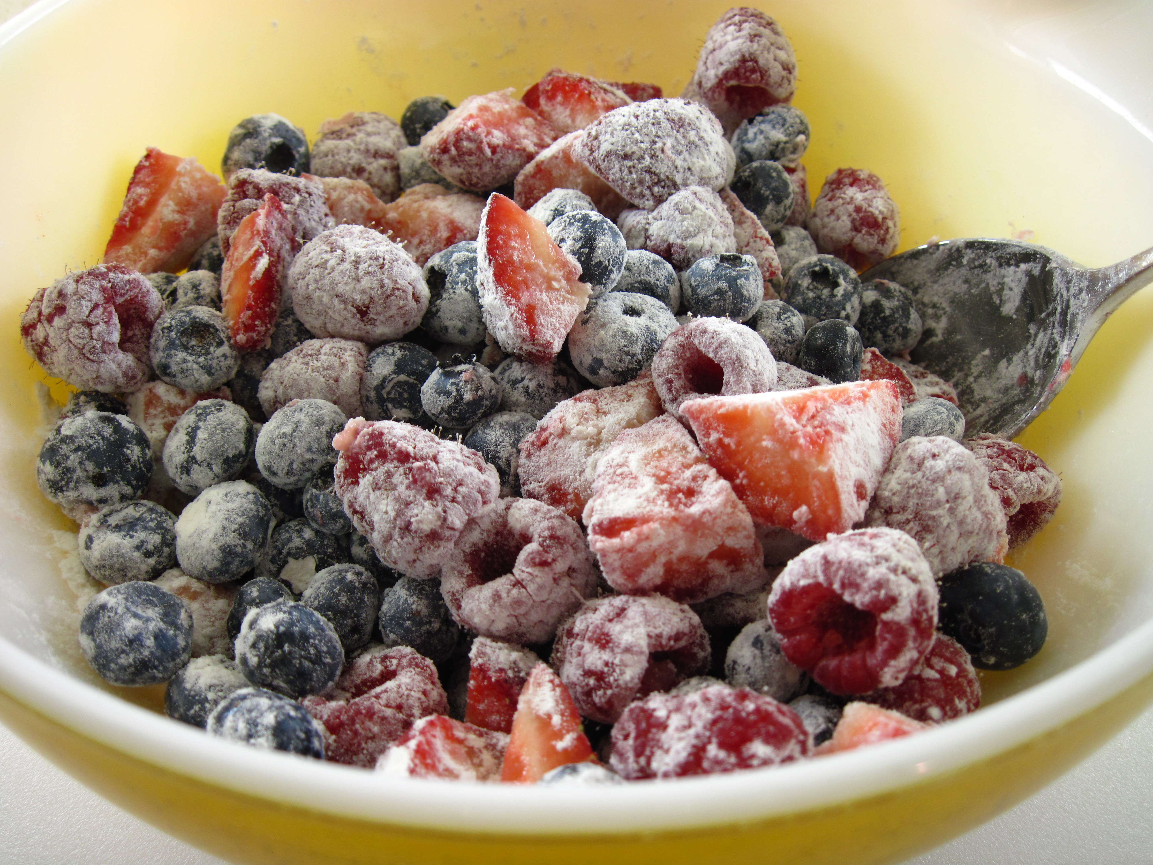 8. Add the berries and the remaining 2 tablespoons of flour to the bowl that the flour mixture was in. Toss gently until the berries are well-covered with flour.